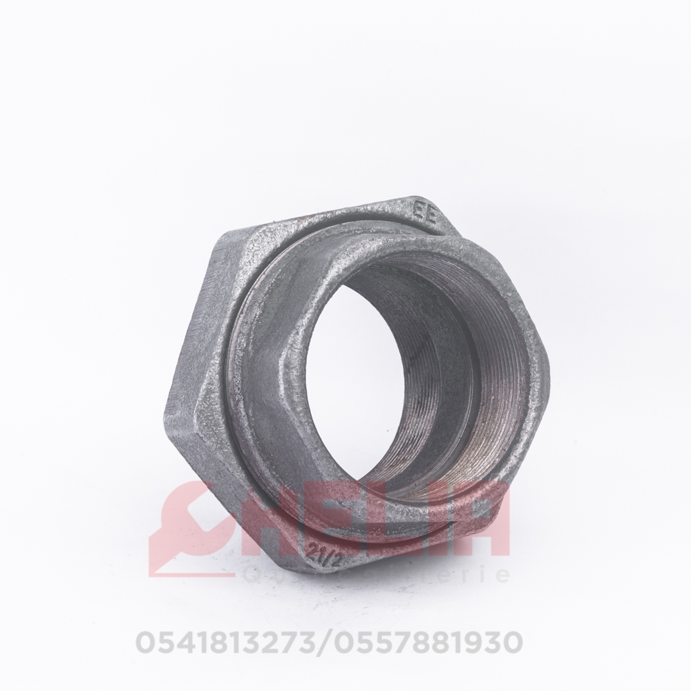 وصلة معدنية مجلفنة بحجم 60/50، مزودة بتصميم اتحاد (أنثي/أنثي) لتوصيل الأنابيب بسهولة وأمان، مع مقاومة عالية للصدأ والتآكل.