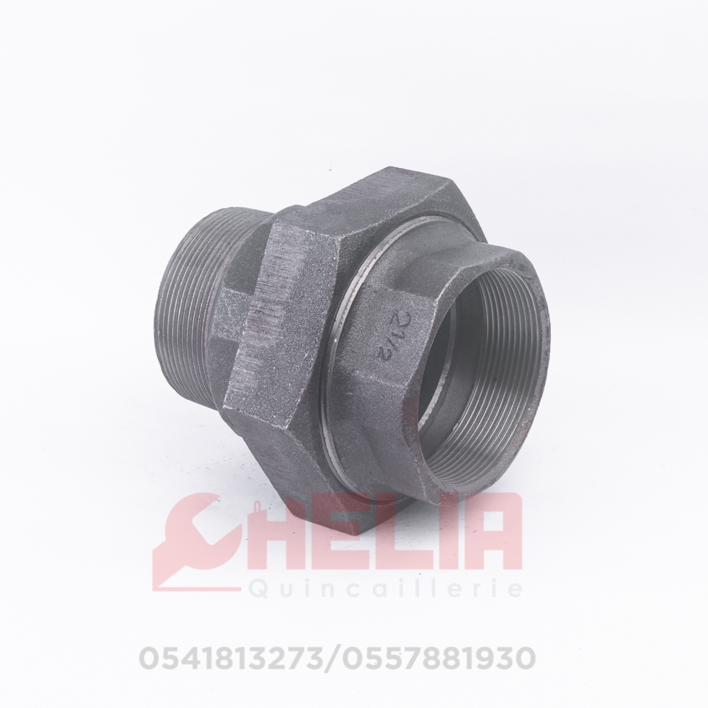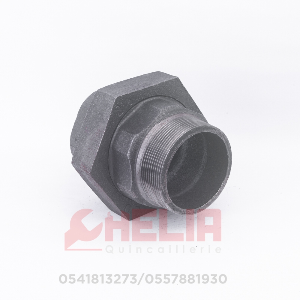 وصلة معدنية مجلفنة بحجم 60/50، مزودة بتصميم اتحاد (ذكر/أنثي) لتوصيل الأنابيب بسهولة وأمان، مع مقاومة عالية للصدأ والتآكل.