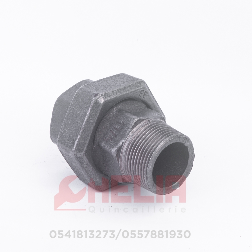 وصلة معدنية مجلفنة بحجم 90/80، مزودة بتصميم اتحاد (ذكر/أنثي) لتوصيل الأنابيب بسهولة وأمان، مع مقاومة عالية للصدأ والتآكل.